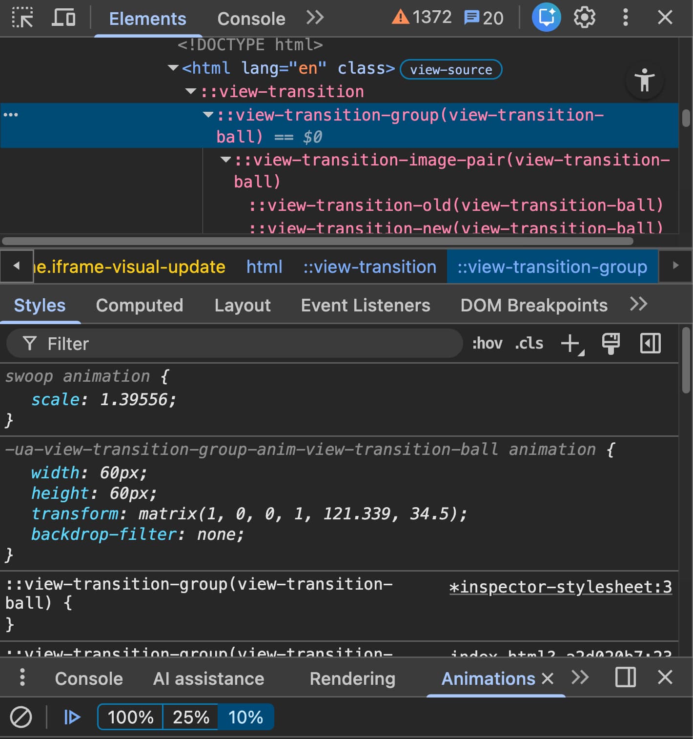 If you pause a view transition, you can see the keyframes and the keyframe name applied to the pseudo elements: